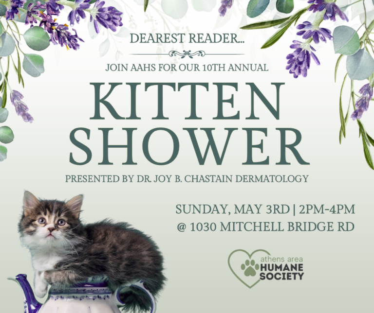 AAHS’s 10th Annual Kitten Shower is coming soon this May 3rd, from 2:00-4:00 pm, at our spacious campus located at 1030 Mitchell Bridge Rd.